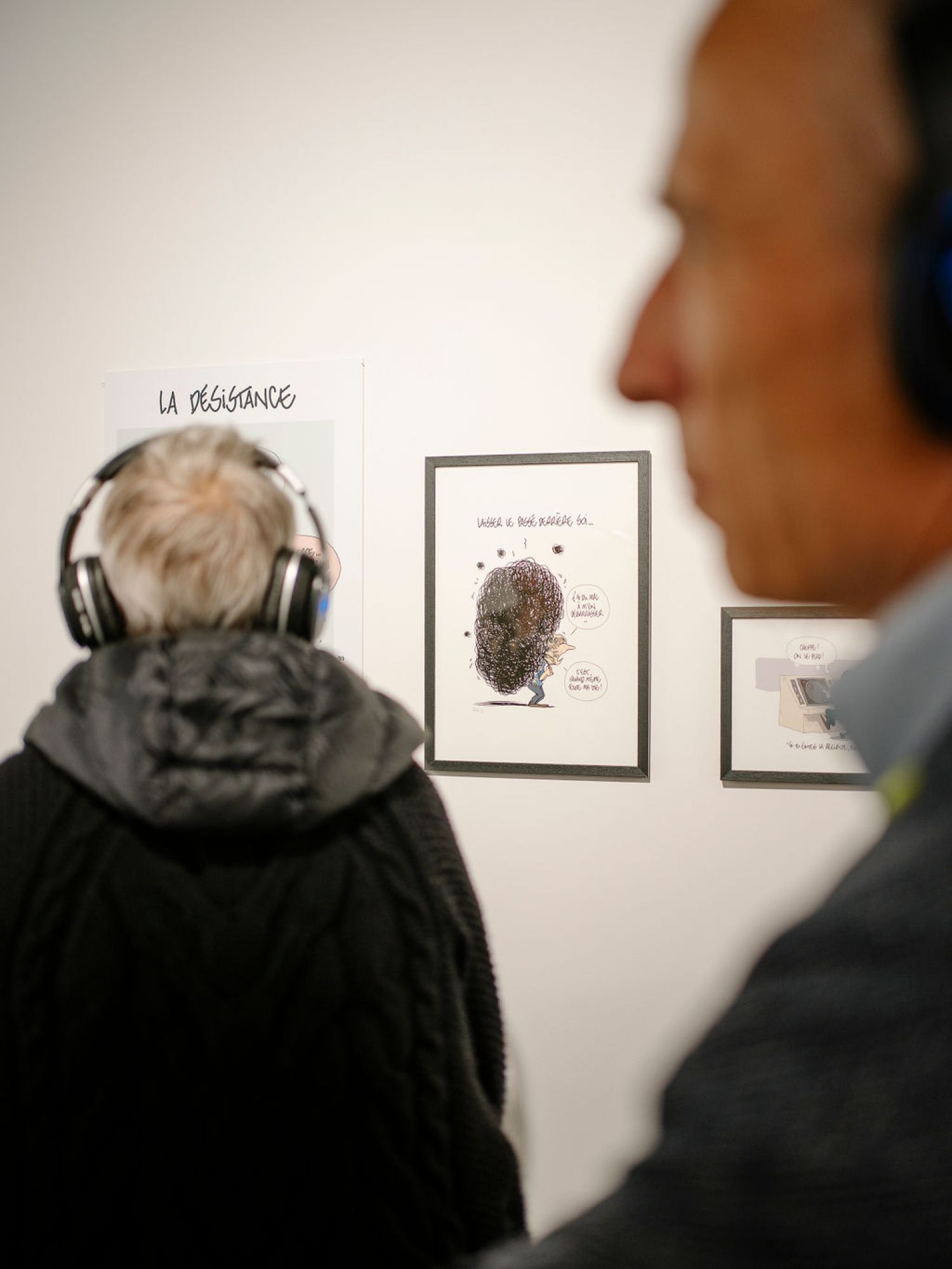Lors de la visite de l’exposition, le public est muni de casques audios. Commence dès lors une déambulation musicale créée par les participant·e·s à ce projet de médiation culturelle conduit par Andrée Oriet en collaboration avec Jura désistance et soutenu par le fOrum Culture. La réalisation de la bande son est effectuée par Alain Tissot.
